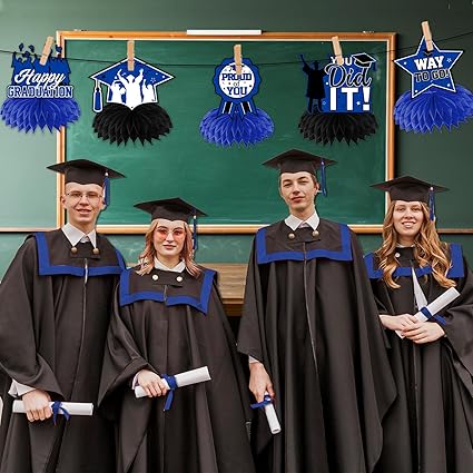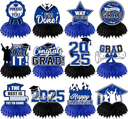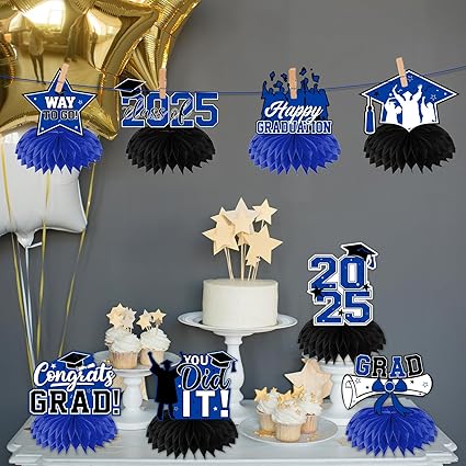 • durable quality: the blue graduation table decorations class of 2025 is made of heavy-duty double-sided cardstock and honeycomb orbs. adopt high-tech digital print with a photo-like shine, and laminated with pet film, which is smooth, waterproof, and tear-resistant and can be applied for a longer time. these stunning these cute and 2025 graduation party decorations blue honeycomb centerpieces make your graduations party worth remembering
