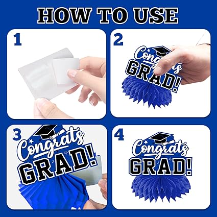 • simple to assemble: these blue graduation decorations class of 2025 can be assembled according to the pictures in just a few seconds. you just need to tea off the glue dot picker on the back of the honeycomb, unfold the honeycomb, and paste the cardstock pattern, repeat on the other side of the card, then you can get a perfect blue graduation centerpieces. the class of 2025 centerpieces are decorated with 3d visual effects, presenting a cute and classic appearance
