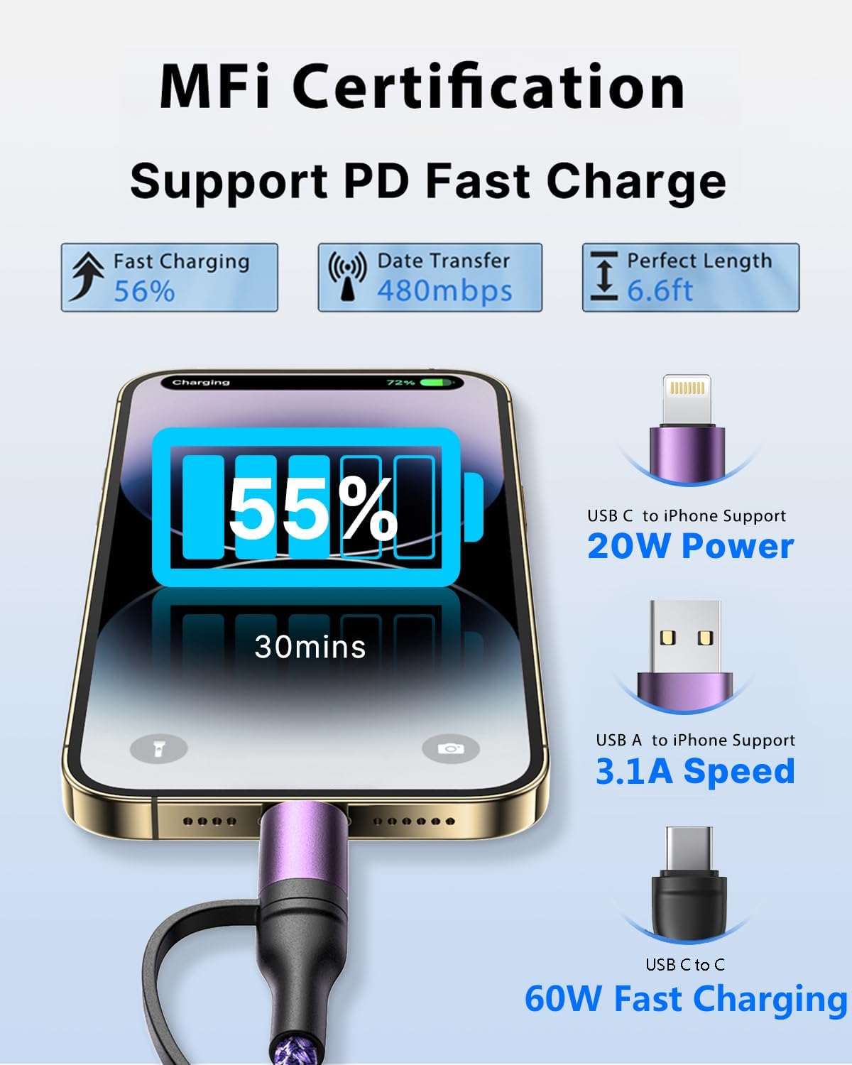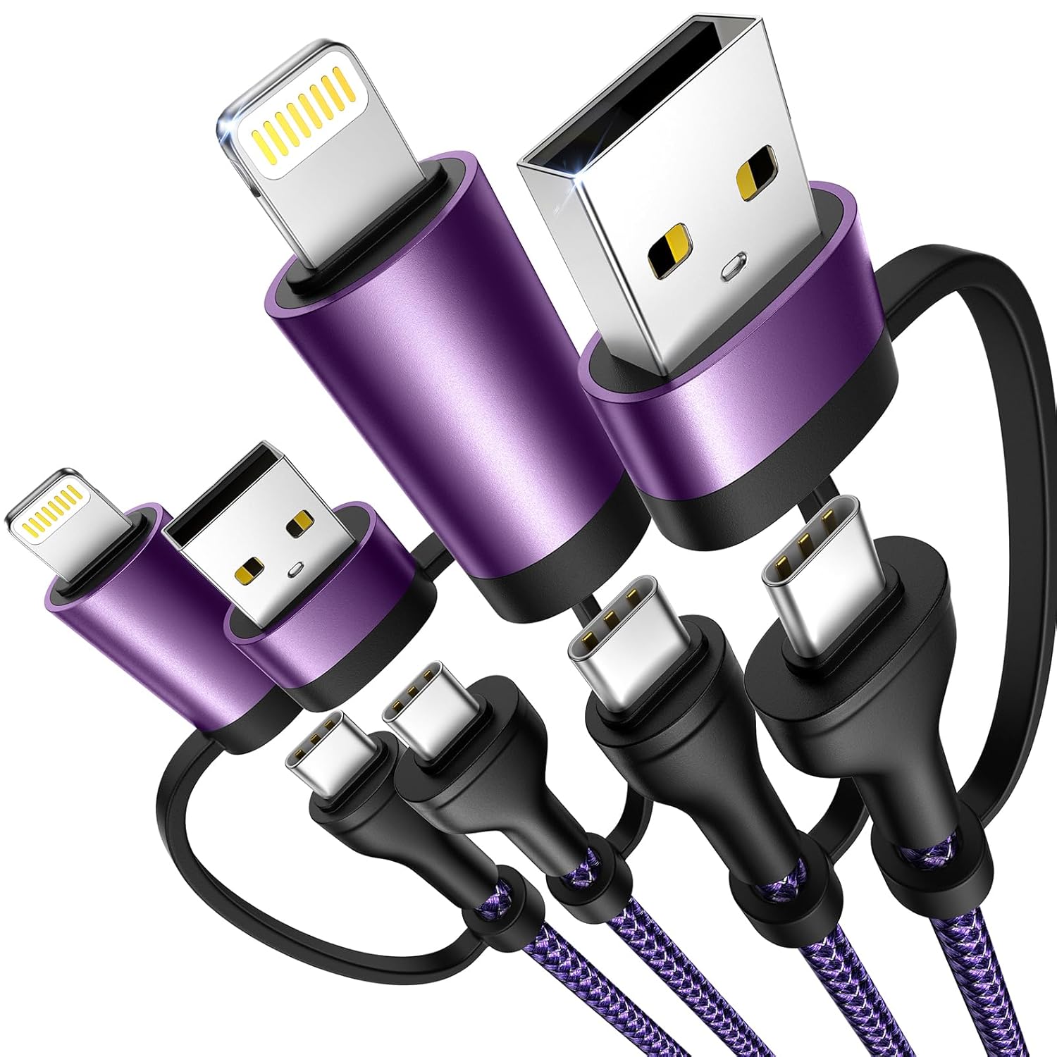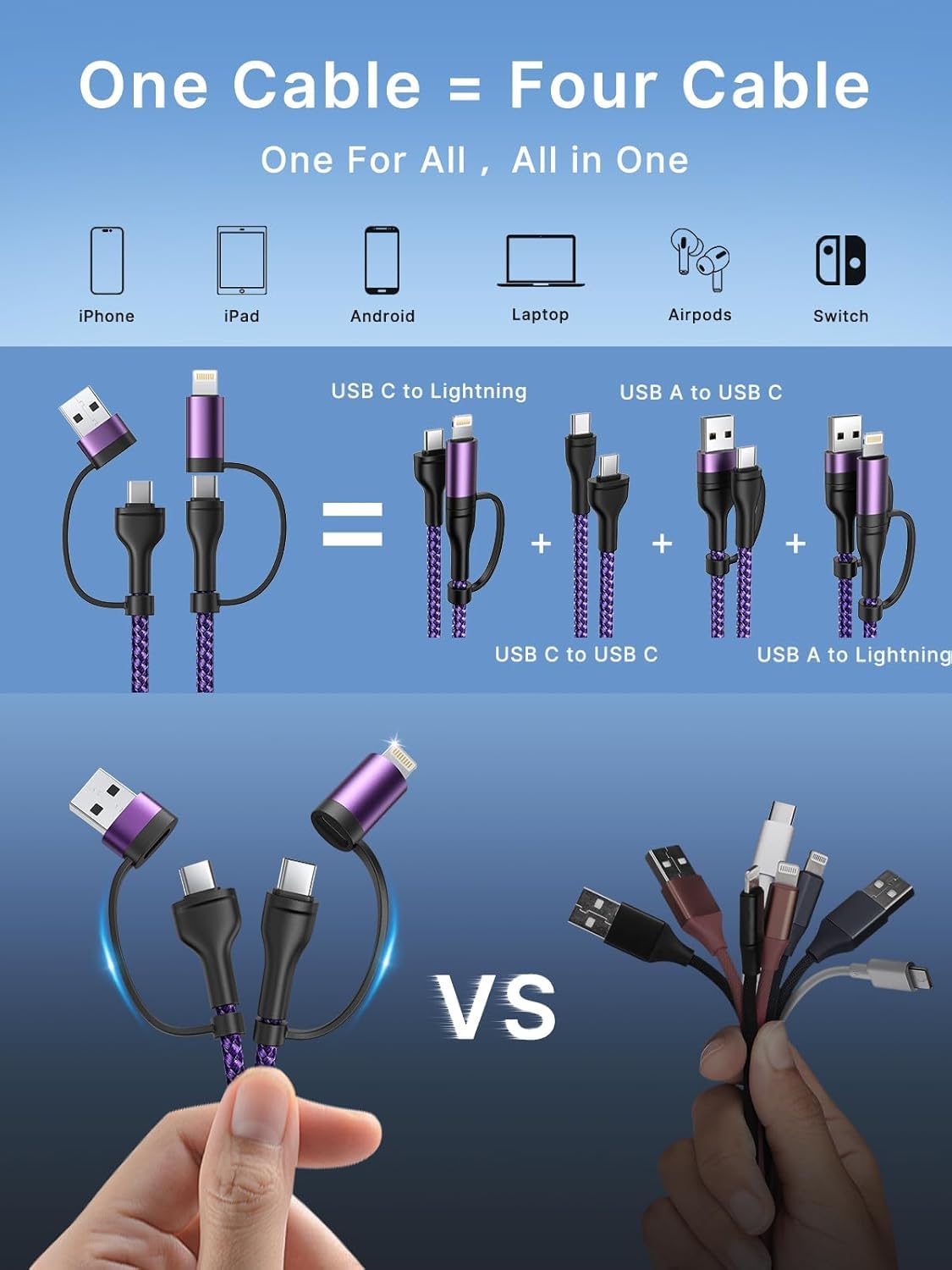 2Pack 6.6ft 4-in-1 Fast Charging USB Cable 60W with Lightning, USB-C & USB-A for Phones, Tablets, and Laptops