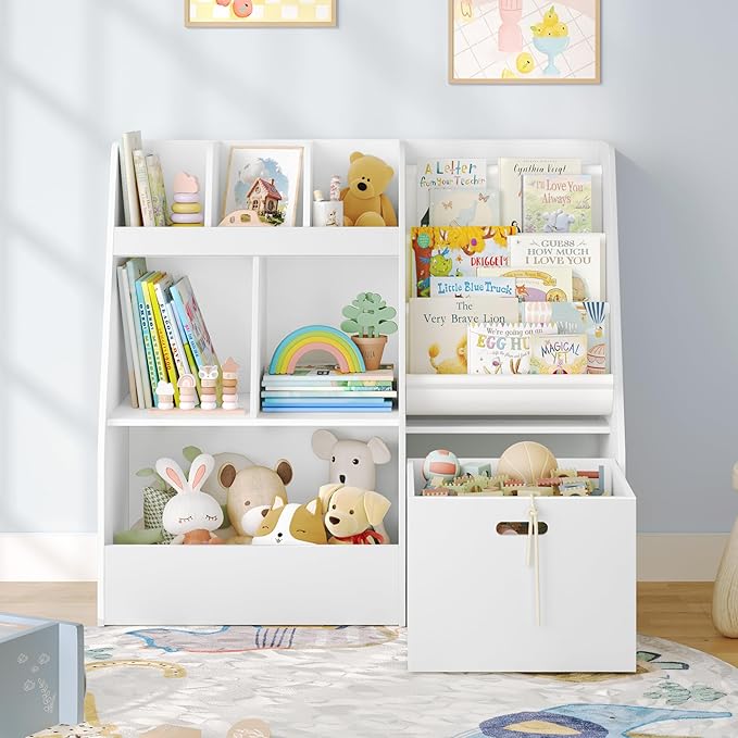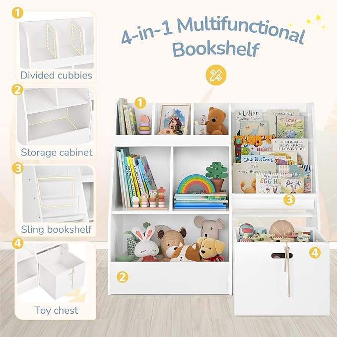 • 4 in 1 Mutifunctional Kids Bookcase: This children’s bookshelf features a 3-tier sling bookshelf, a toy shelf with wheels, a fixed toy bin, and 5 storage shelves; Ideal for organizing books, toys, and essentials while keeping the room neat and tidy