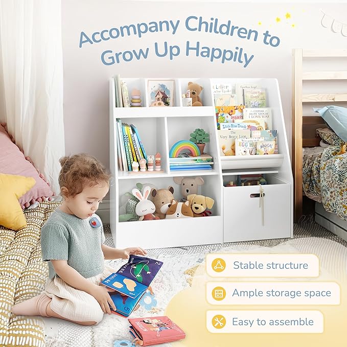 • Easy Assembly: This toy storage rack with a baby bookshelf features clear part markings and easy-to-follow instructions, making the setup quick and straightforward; each component is designed for a precise fit, ensuring a smooth installation process
