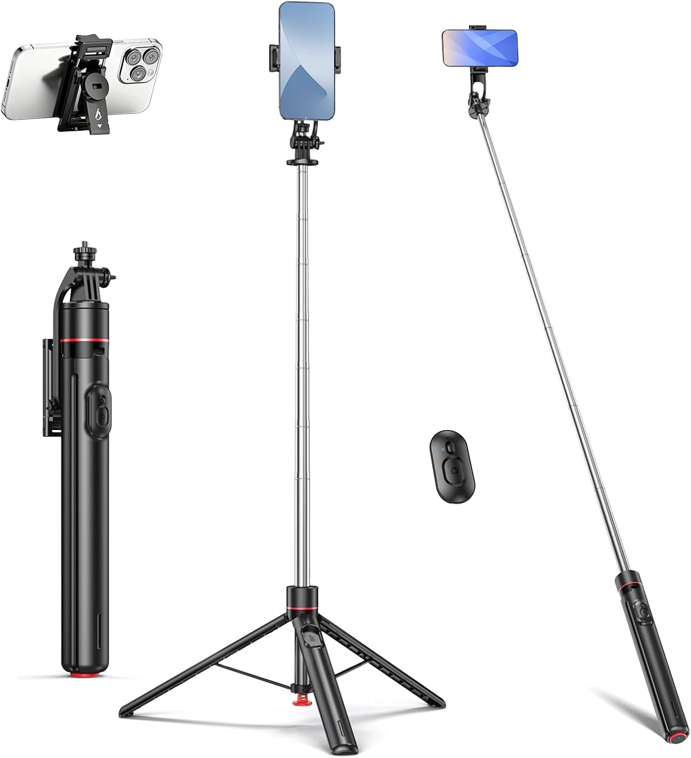 Adjustable Height up to 67 Inches: Extend the tripod for selfies, group photos, vlogging, or landscape shots. Compatible with phones, cameras, and action cameras with easy angle adjustments.