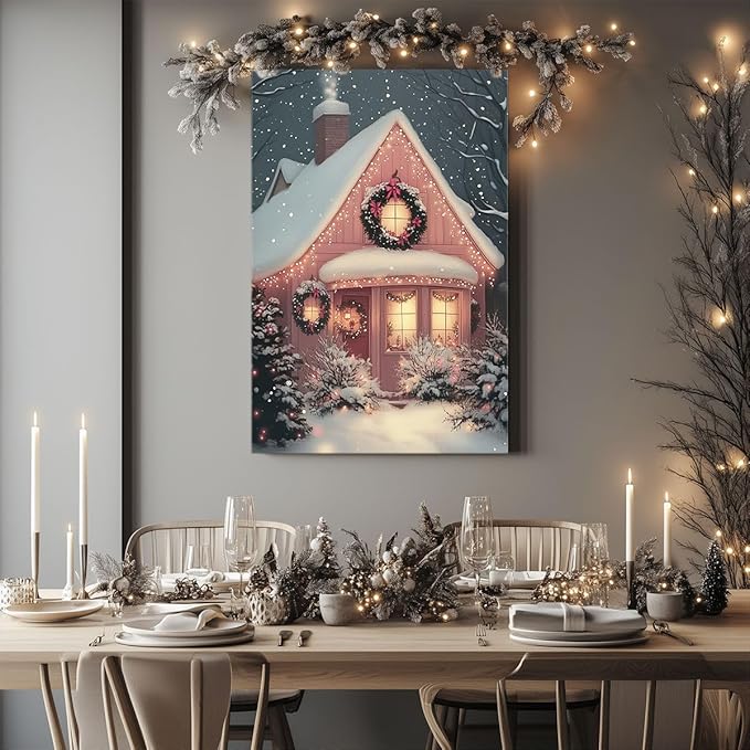 • Capture the warmth of the holiday season with this charming snowy Christmas cottage wall art, perfect for adding festive cheer to your home.