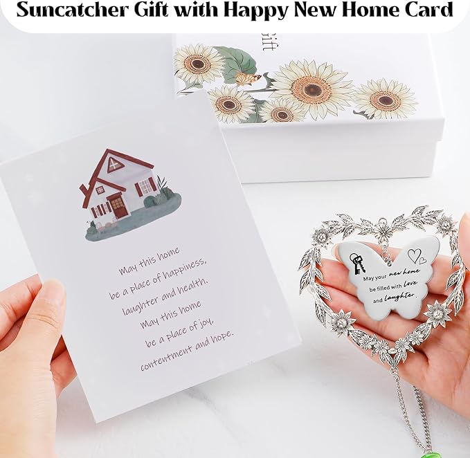 • This sun catcher window hanging ornament is a beautiful, thoughtful gift for housewarming. The butterfly metal sheet is carved with sweet happy new home message, and the crystal casts rainbow light when sun hits. The families sit together to enjoy the rainbow and look forward to there new life.