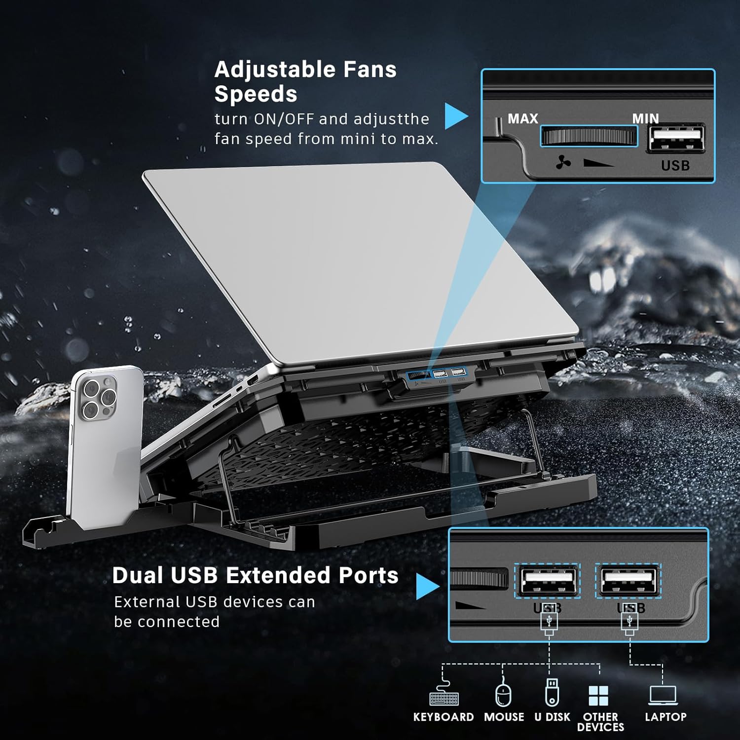 Quiet Operation and Dual USB Ports: Operates below 30dB for minimal noise, with adjustable fan speeds and LED indicators. Includes two USB ports—one for powering the fan, one for peripherals—plug-and-play without drivers.