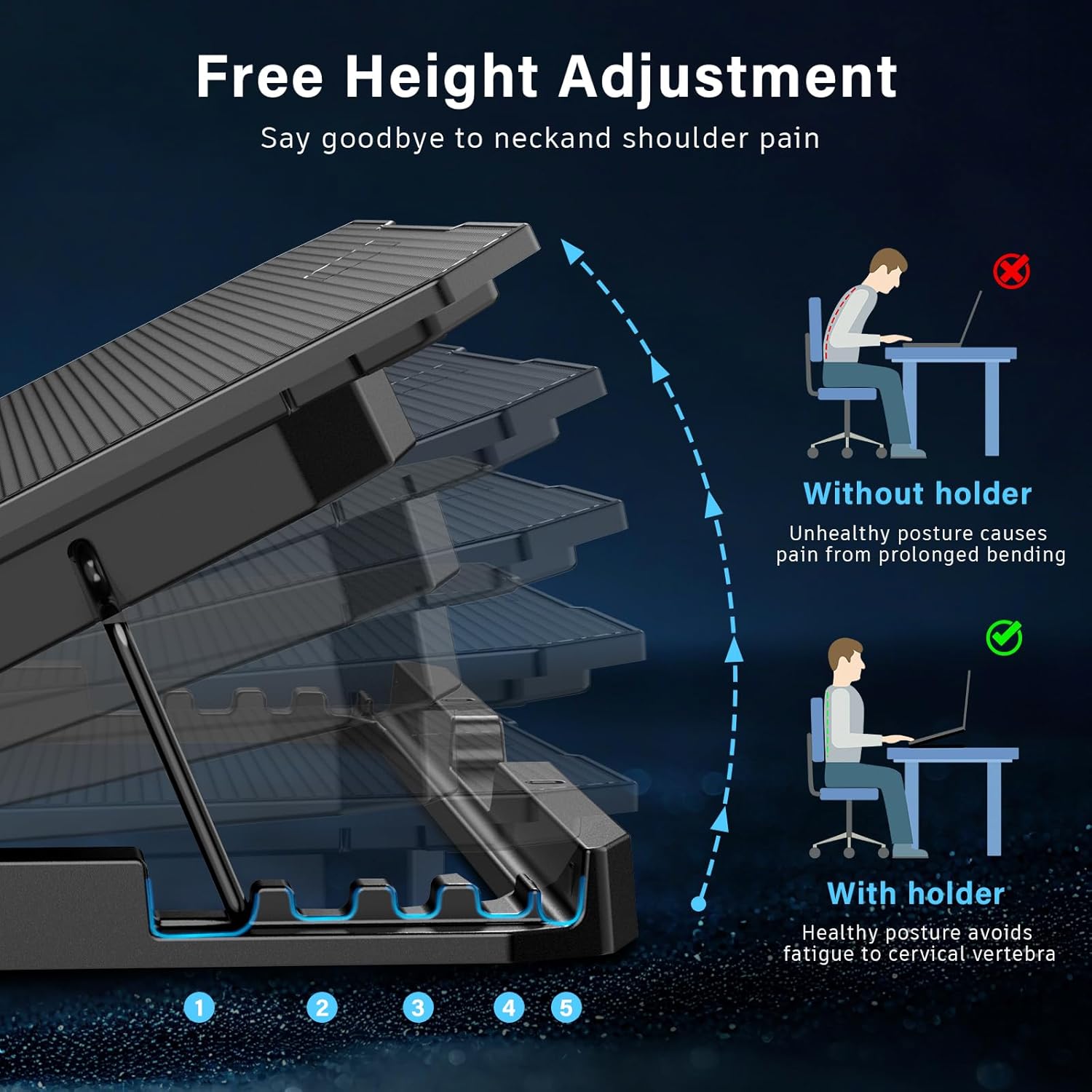 Ergonomic Adjustable Height: Five height settings allow personalized viewing angles to reduce neck and back strain, making it ideal for gaming, work, or study sessions while keeping laptops cool.