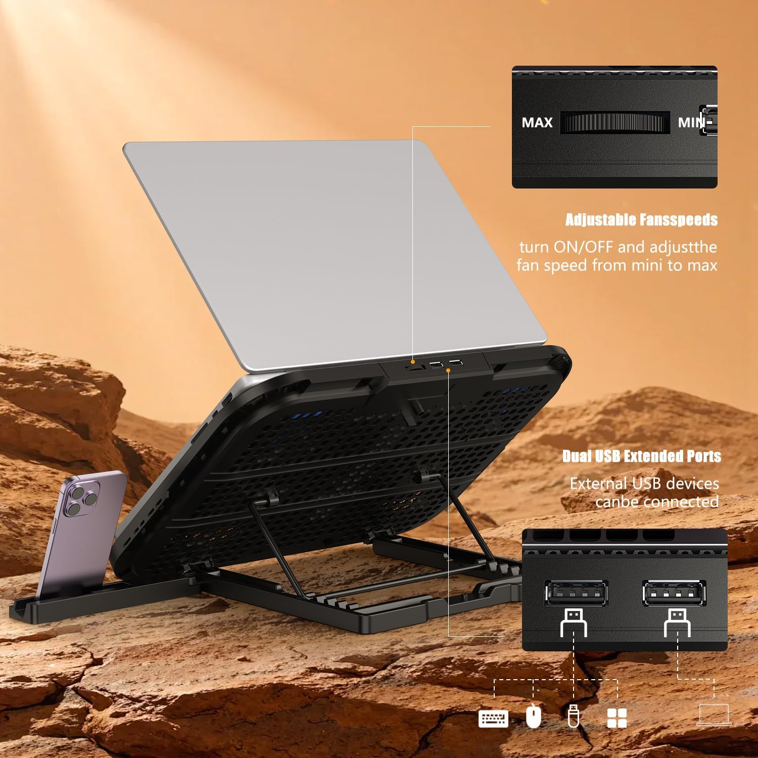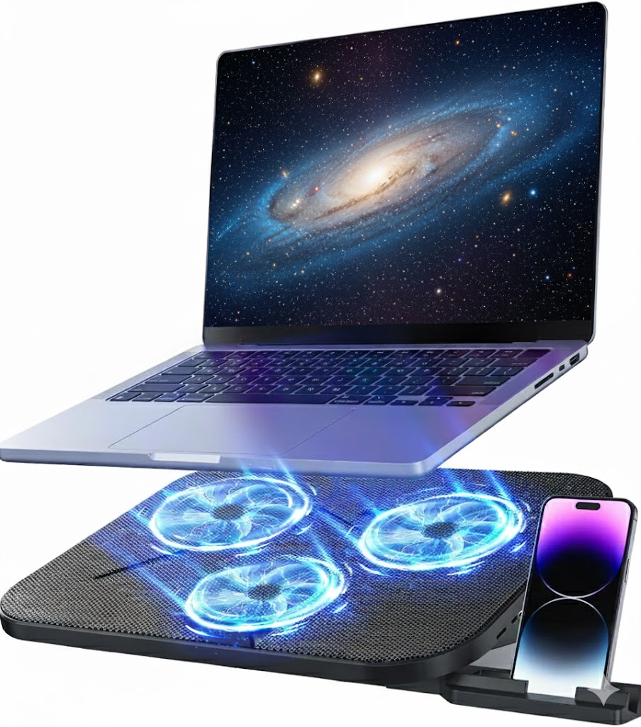 Laptop Cooling Pad with 3 Quiet Fans, Adjustable Stand, USB Hub & Phone Holder, Fits 12–17″ Laptops