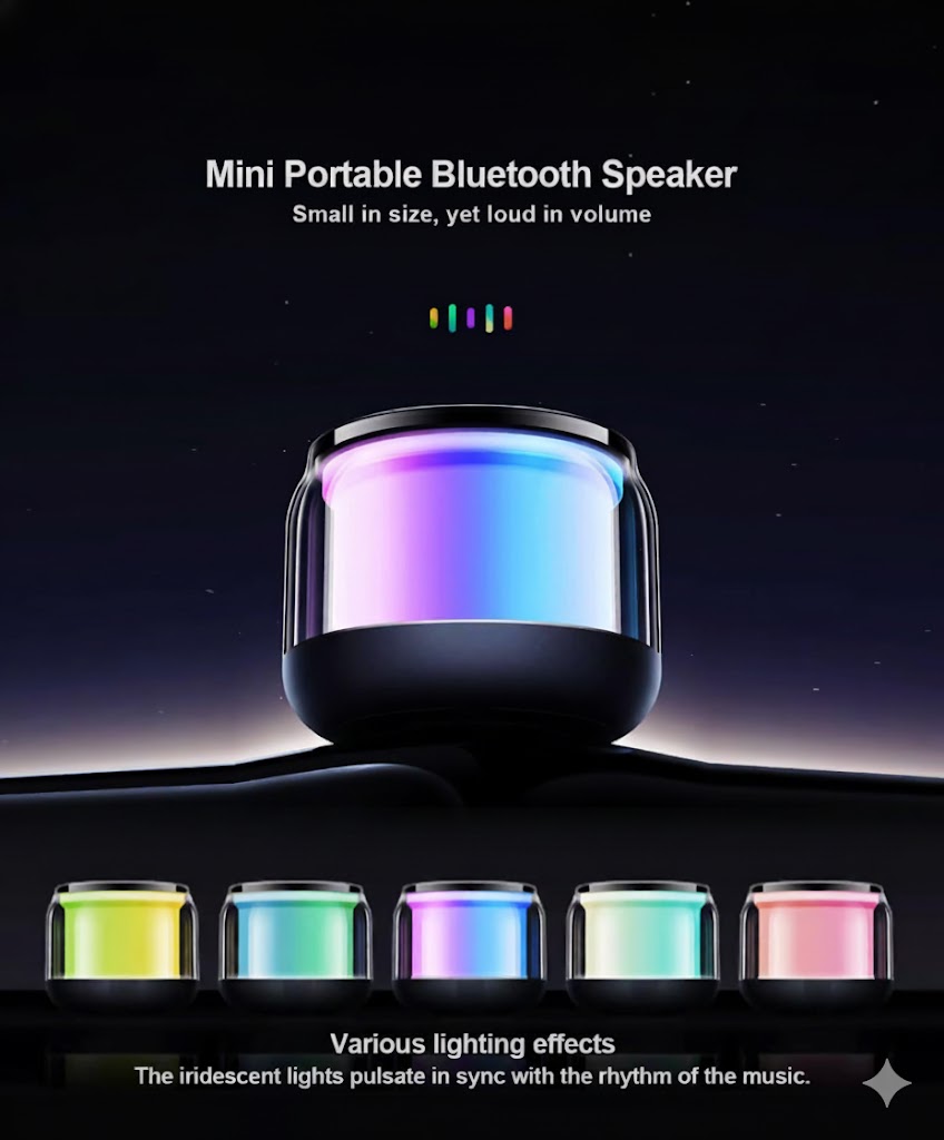 Colorful LED Light Modes: Mini portable Bluetooth speaker features up to 16 color-changing light modes, easily adjustable to match your mood and create a fun, vibrant atmosphere.