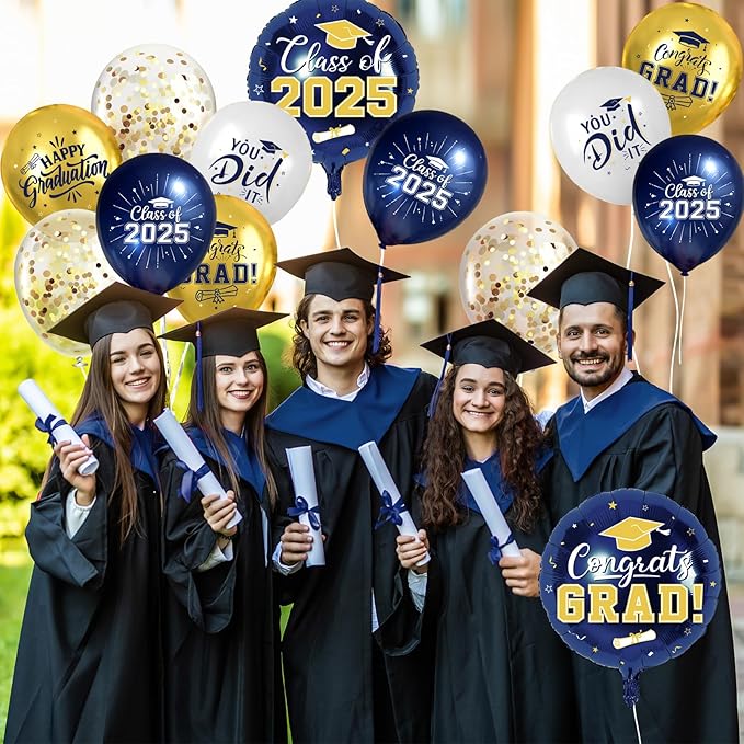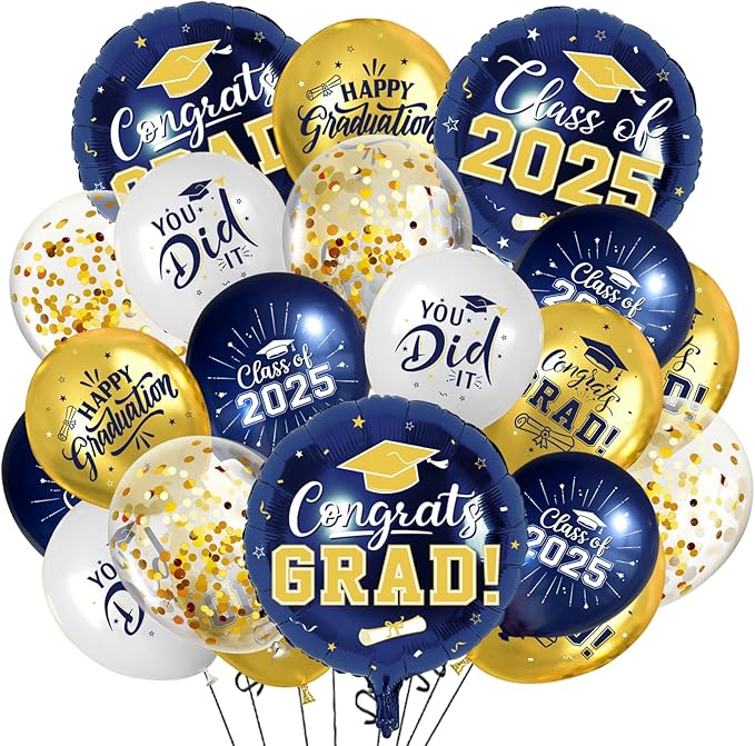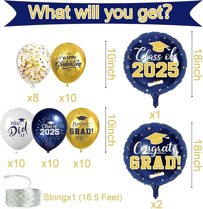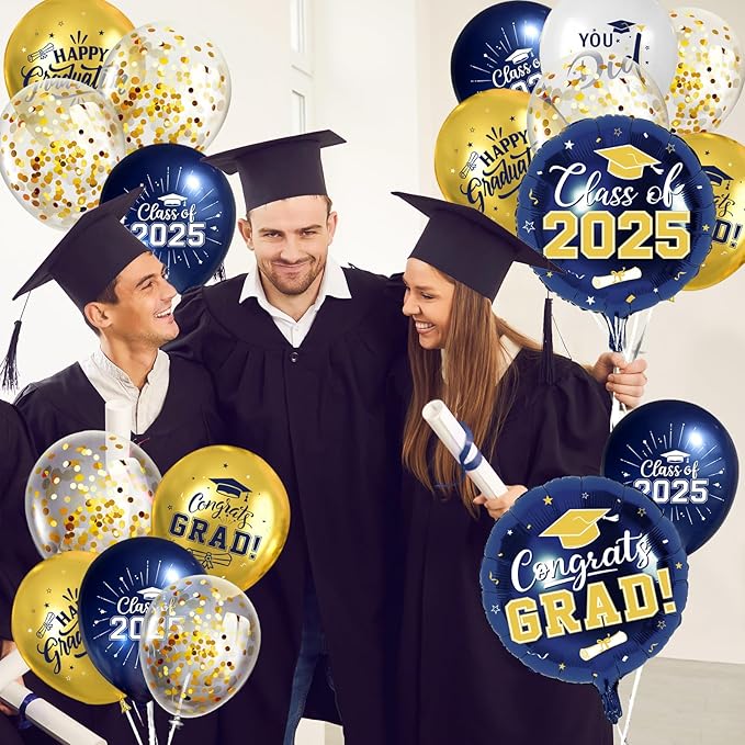 • 【Graduation Theme】Our navy blue and gold grad balloons specially designed with graduation cap, graduation scroll and grad confetti, that is embellished with elegant letters “Congrats GRAD!” “Class of 2025” “YOU Did IT” “HAPPY graduation”. Fantastic design creates a dynamic and cheerful atmosphere for graduation party.