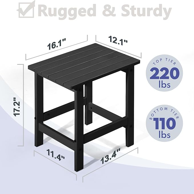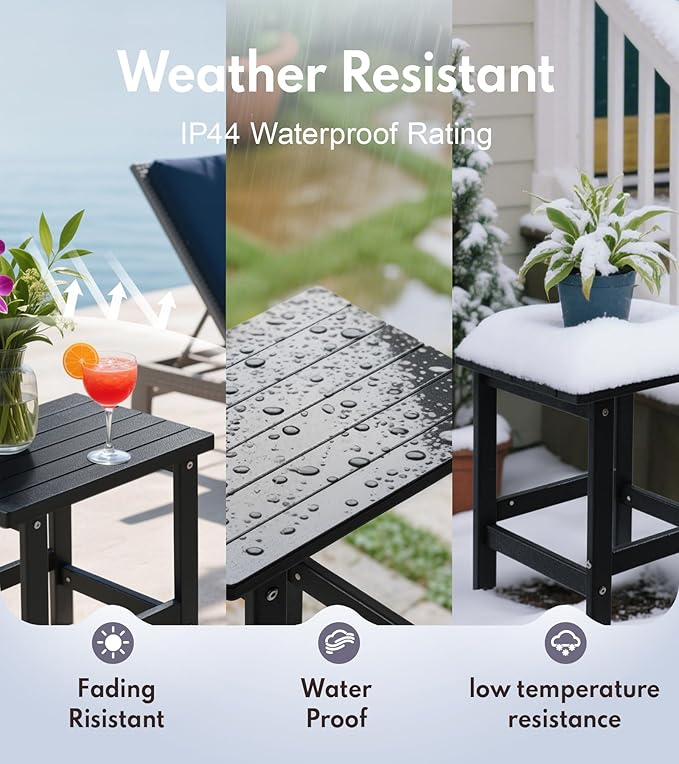 • 【Durable Material & Weather Resistant】The patio side table are made of sturdy and waterproof material HDPE, which is more weather resistant. The outdoor side tables can withstand a range of severe weather conditions like burning sun, strong wind or heavy rain yet retain the original color for years to come, never fade, rust, peel and rot.