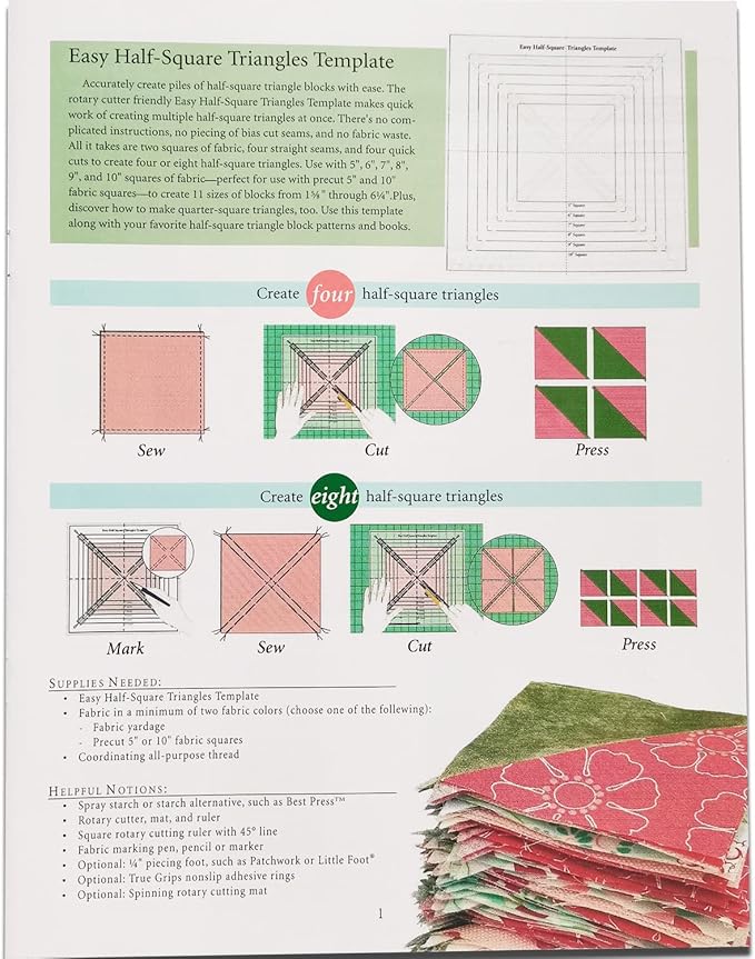 • Template creates 11 sizes of half-square triangles from 1-5/8”–6-1/4”